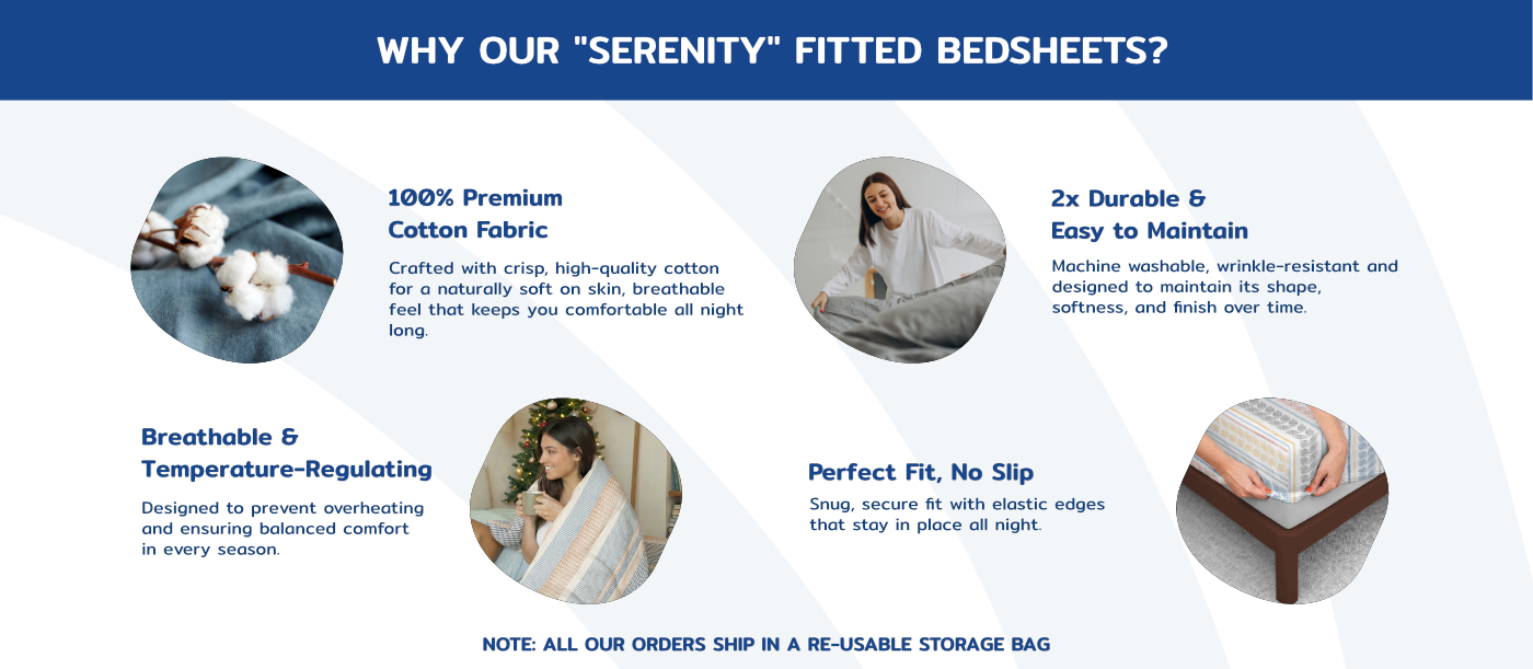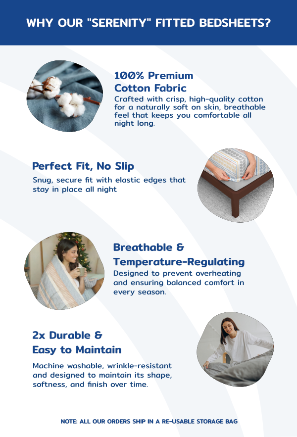 Our Serenity fitted bedsheets are made from 100% premium cotton, offering exceptional softness, breathable comfort, and long-lasting durability.