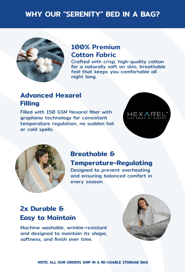 Transform your bedroom with our Serenity 100% Premium Cotton Coordinated Double Bed-in-a-Bag, a complete bedding solution designed for ultimate comfort and natural elegance. This set includes a luxuriously soft Double-size bed sheet, two full-size pillow covers, and a premium double comforter filled with HEXAREL, an advanced thermoregulating fiber for year-round coziness. Crafted with exceptional quality , the naturally breathable and feather-soft fabric is skin-friendly and keeps you cool and comfortable throughout the night. Perfectly coordinated for a polished look, this all-in-one set creates a cozy and inviting sleep space with effortless style. It comes in a convenient reusable storage bag, making it perfect for gifting or easy storage.