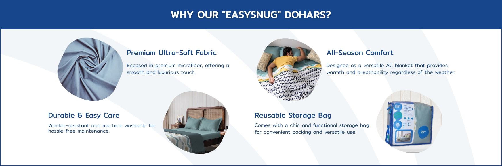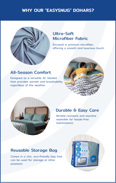 The EasySnug single dohars by THE HAPPY POD are designed for year-round comfort and style. Filled with 80 GSM soft flannel, they provide a lightweight, cozy feel that’s perfect for use as an AC blanket. Encased in premium ultra-soft microfiber fabric with vibrant prints, these dohars are both functional and aesthetically pleasing. Each dohar comes with a stylish reusable storage bag for added convenience.